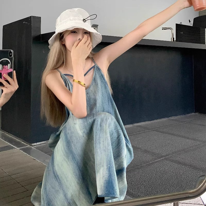 Retro Tie-Dye Strap Dress – Summer Loose Boho Beach Maxi Dress for Vacation