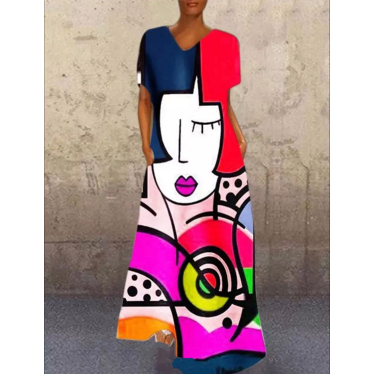 Vintage-Inspired Cat Print V-Neck Maxi Dress – Retro Floral Long Dress