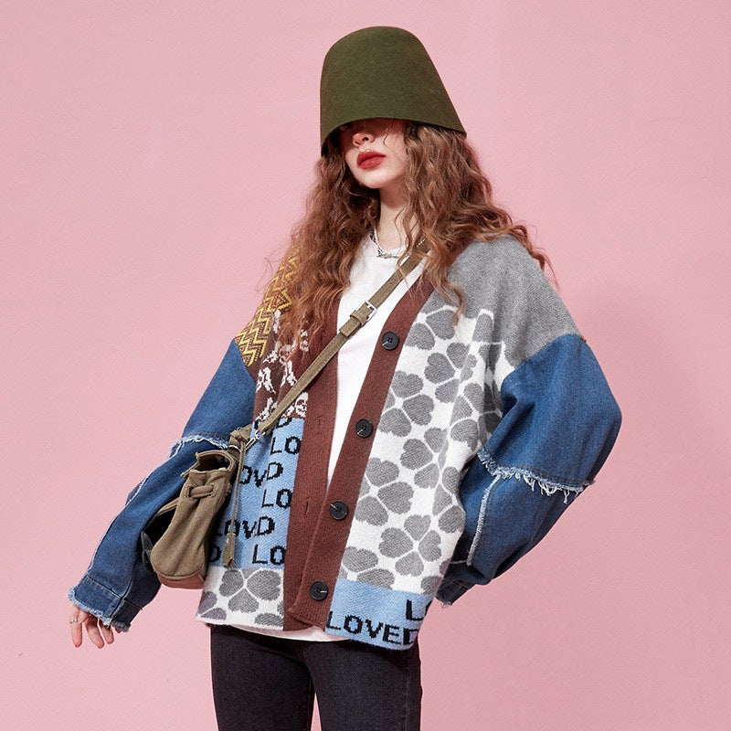Women's Denim Patchwork Sweater Cardigan
