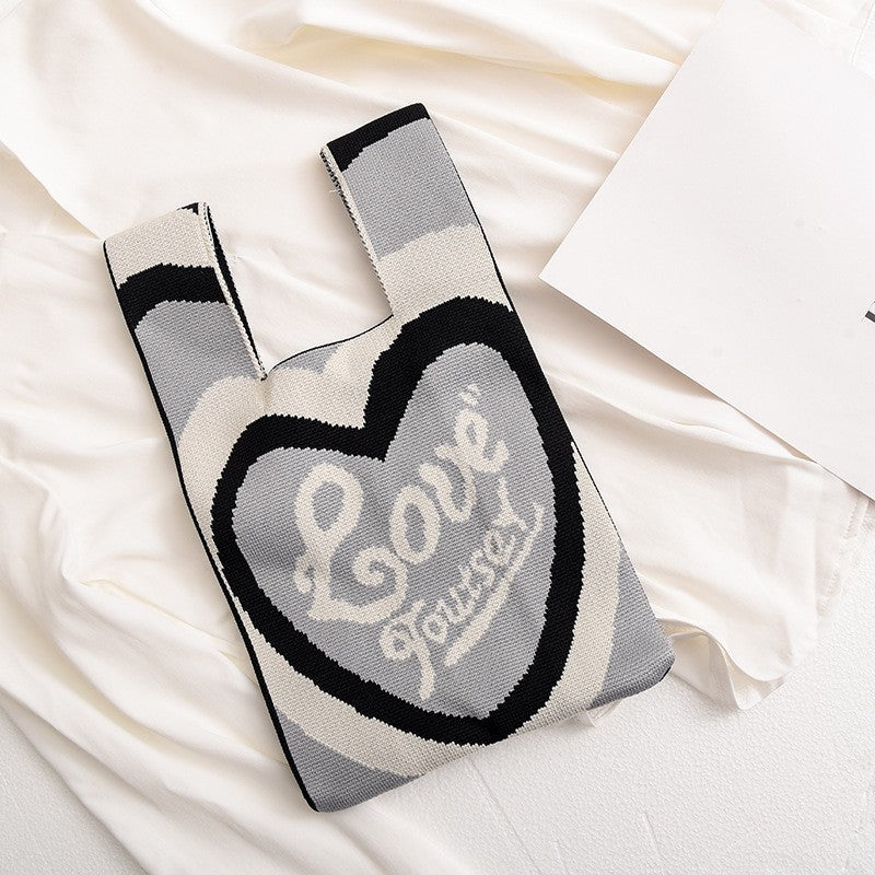 Contrast Color Heart Pattern Knitted Handbag Reusable Bag