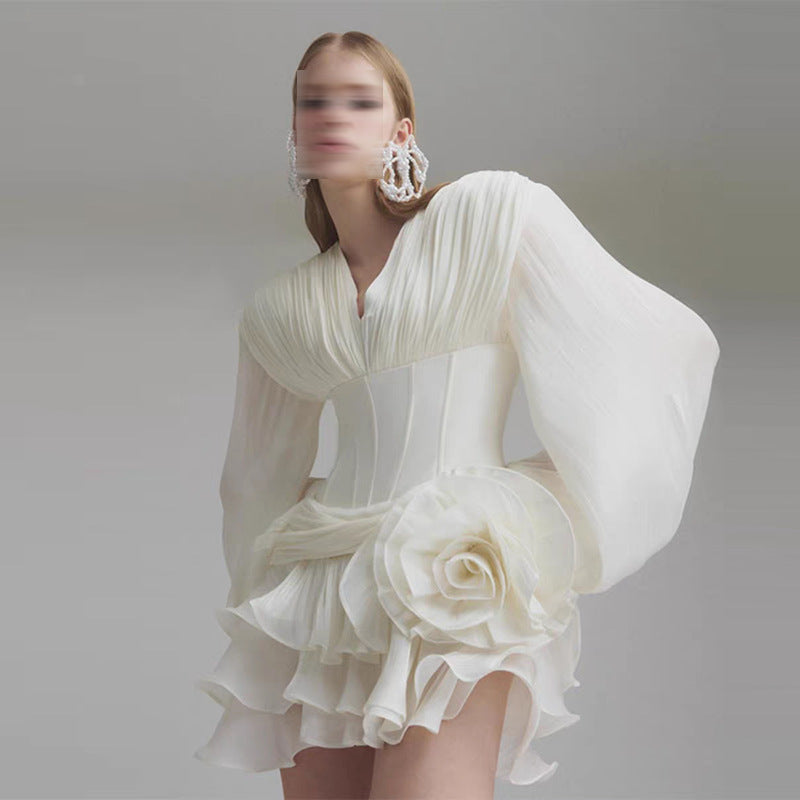 Elevate your warm-weather wardrobe with this charming Women's Summer V-Neck Puff Sleeve Short Hem Floral Ruffle Dress. Designed for comfort and elegance, this dress features a flattering V-neckline, playful puff sleeves, and a short, flowy hem adorned with delicate ruffle detailing. The 3D floral accents add a touch of feminine charm, making it perfect for brunches, dates, or sunny outings.
