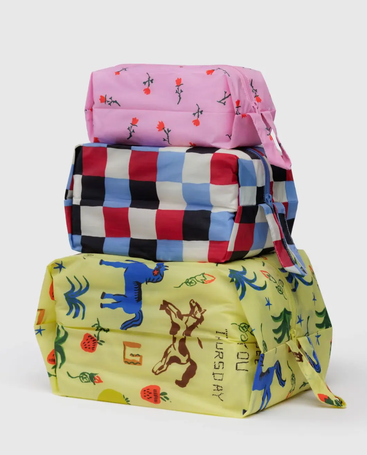 A set of three zippered pouches for travel and organization, with loops for carrying and hanging on the go. Perfect for packing, organizing your bag, or home tidying.