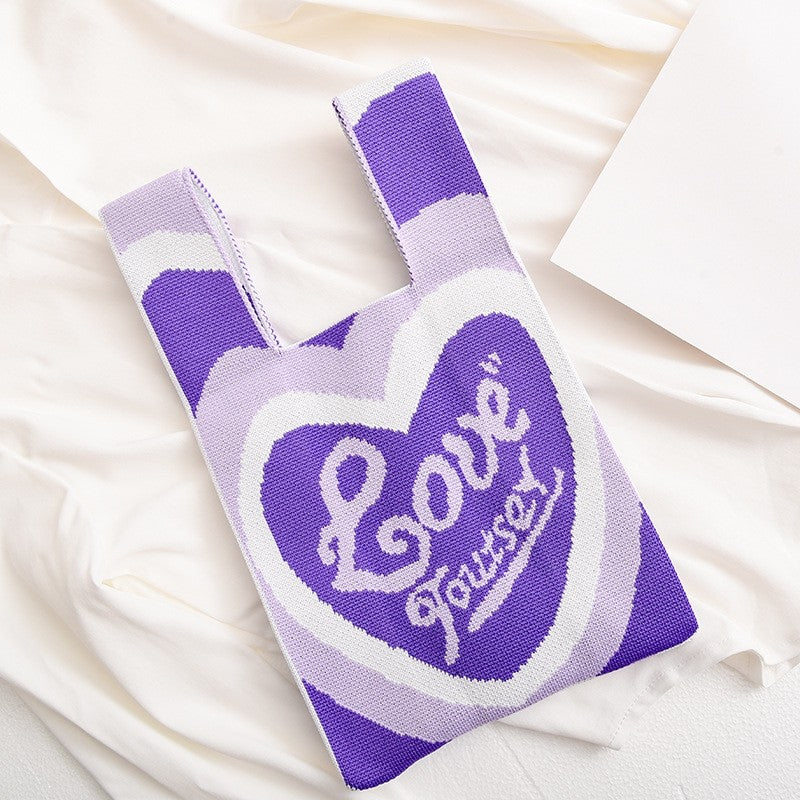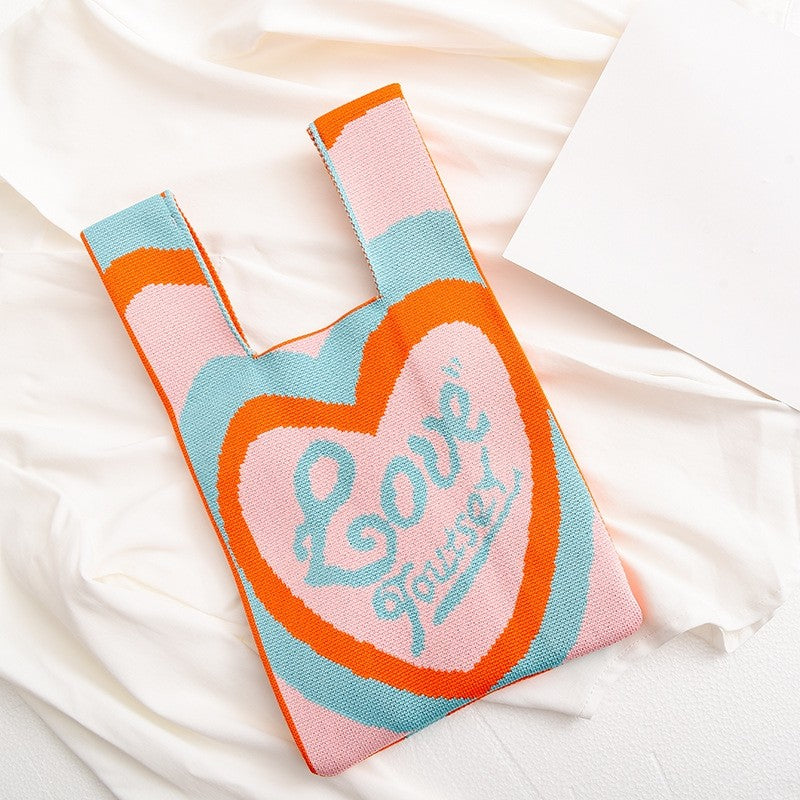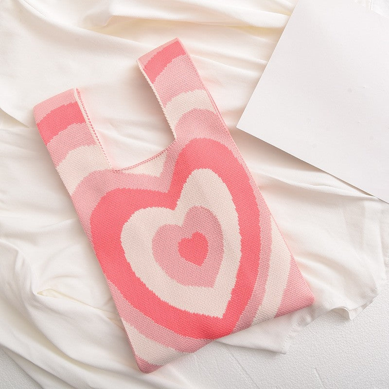 Contrast Color Heart Pattern Knitted Handbag Reusable Bag