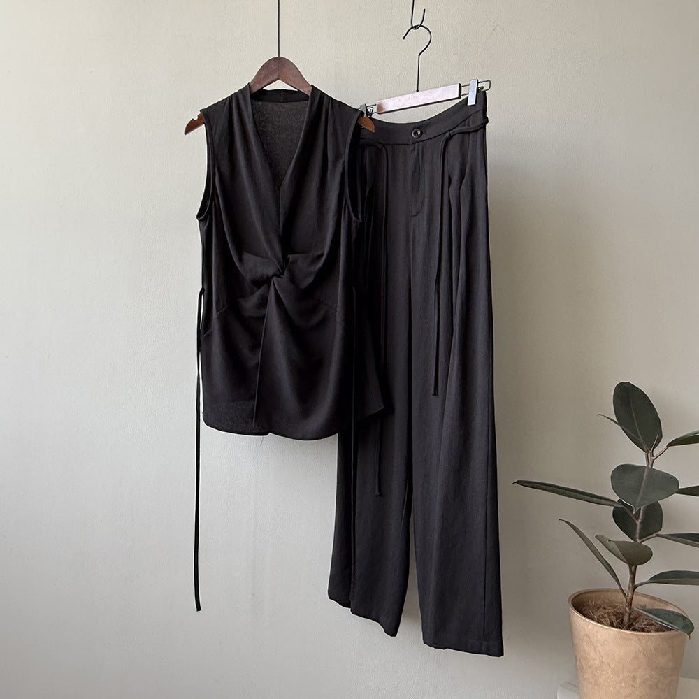 Elevate your summer wardrobe with this stylish Designer Twist Knot Sleeveless Blouse Set. Perfect for casual outings or elegant occasions, this matching set features a fashion-forward twist-knot detail blouse paired with effortlessly chic wide-leg floor-length pants.