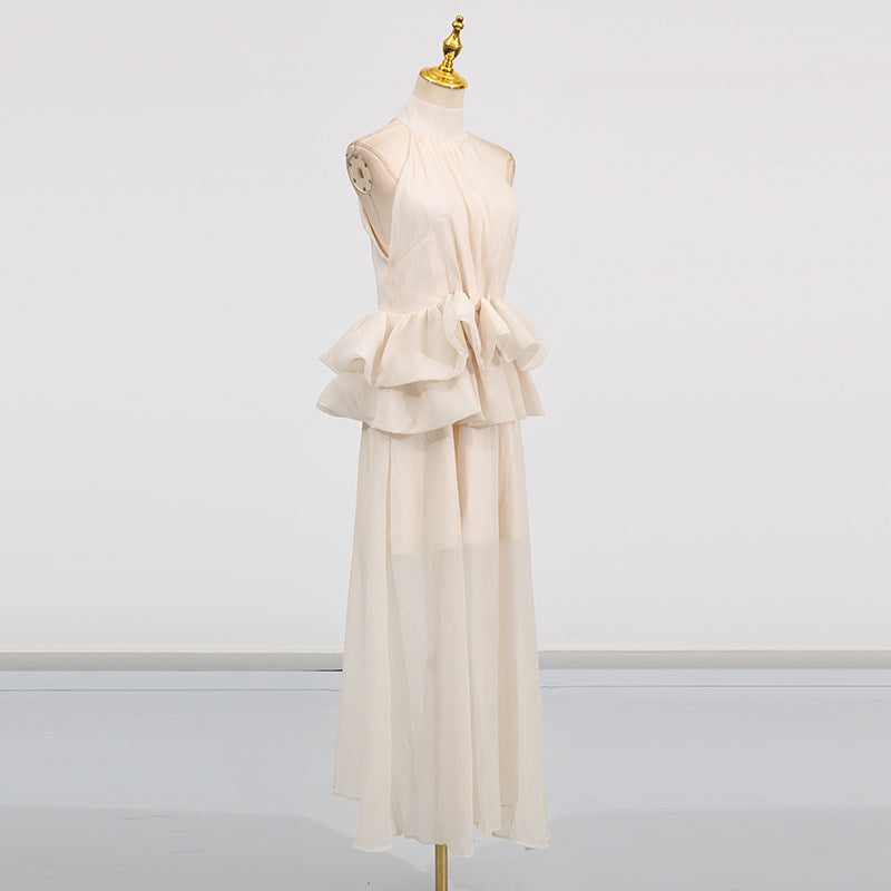 Elegant High-Neck Sleeveless Summer Dress with Waist Ruffle Detail
