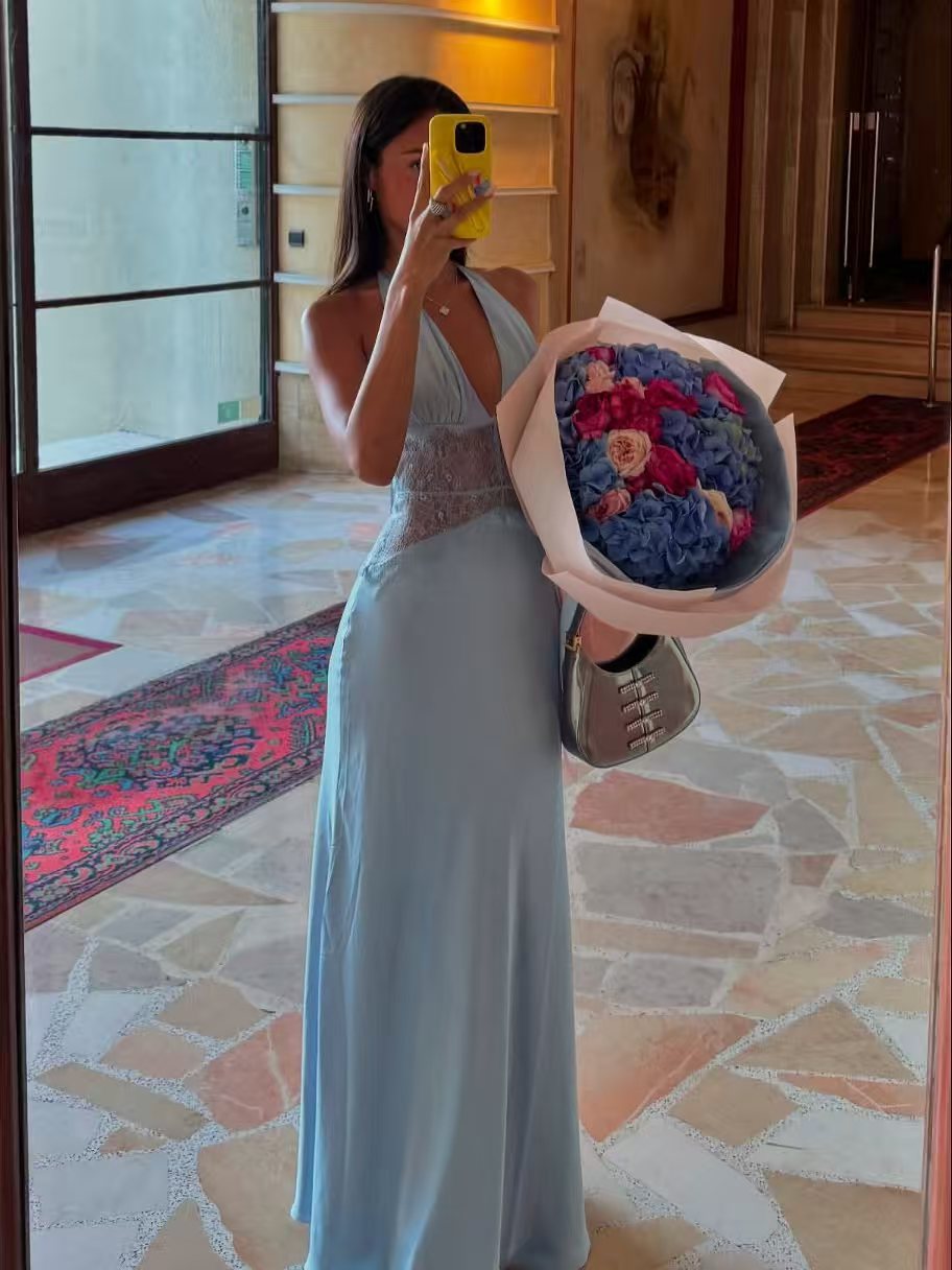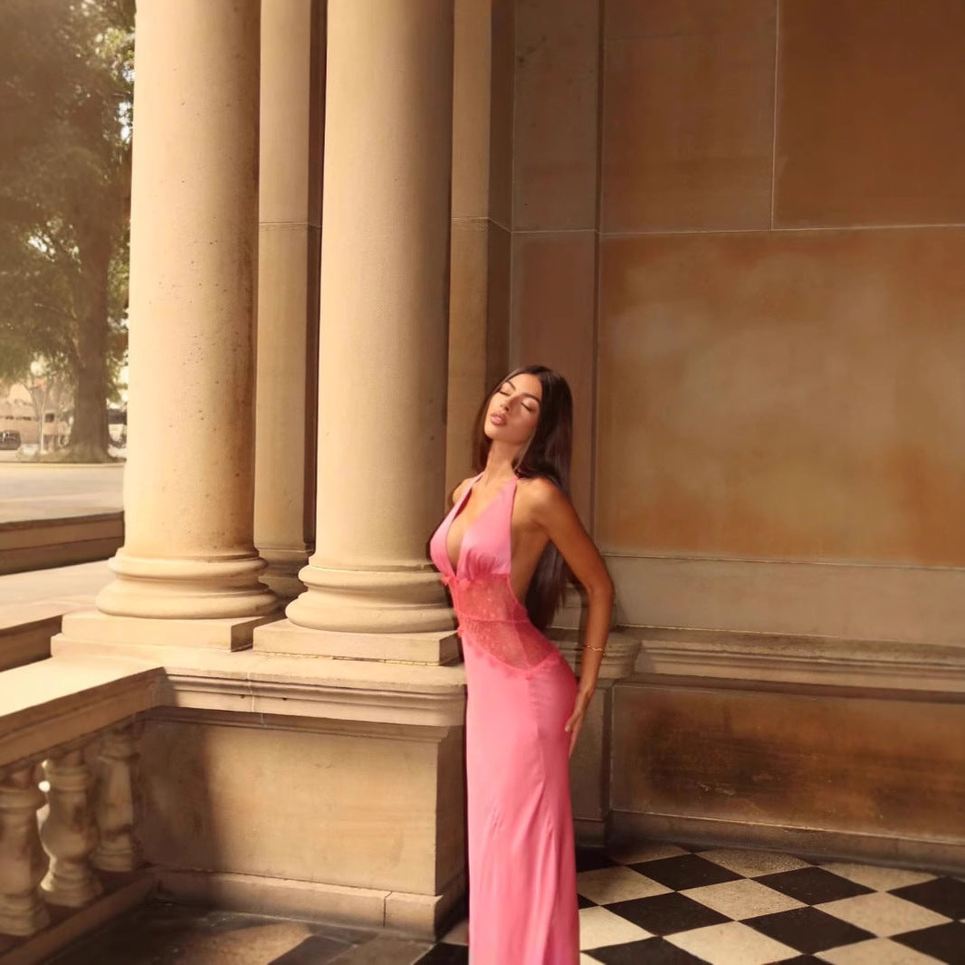 Command attention and radiate confidence in our stunning deep V lace dress. Meticulously designed to flatter your silhouette, this dress features a daring yet sophisticated plunging neckline and an alluring open back, elegantly secured with a delicate tie-fastening. Crafted from exquisite sheer lace and a sleek lining, it creates a mesmerizing silhouette that is both sexy and refined.