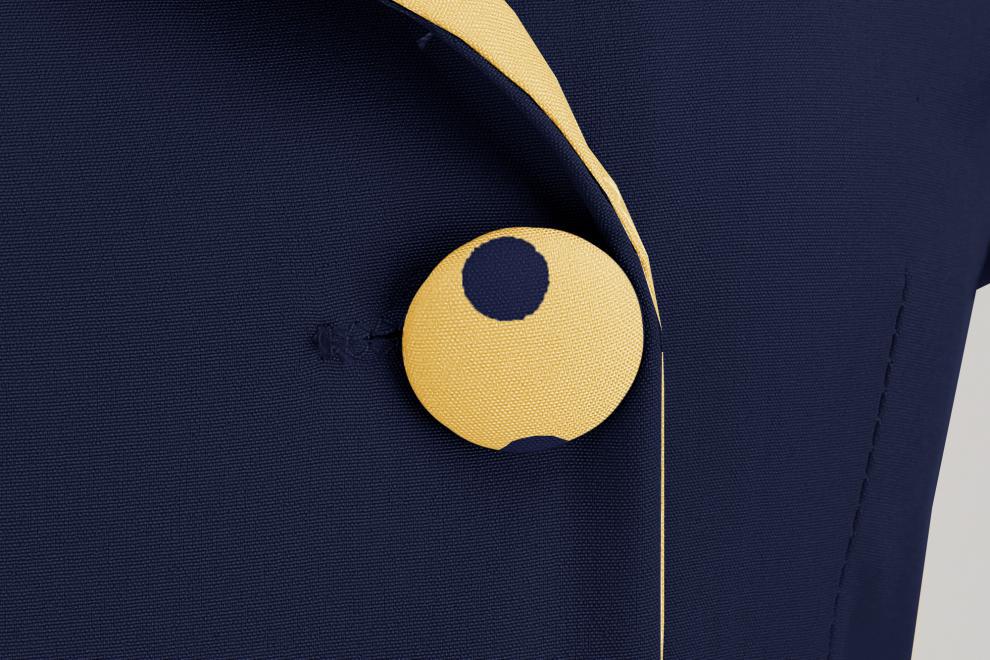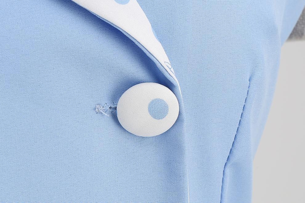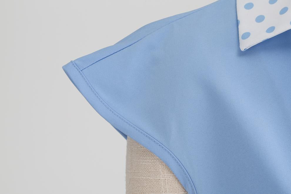 This stunning dress features a classic notched V-neck collar that elongates the neckline for an elegant silhouette. The playful all-over polka dot print on a solid background creates a visually striking look that is both modern and retro-inspired.