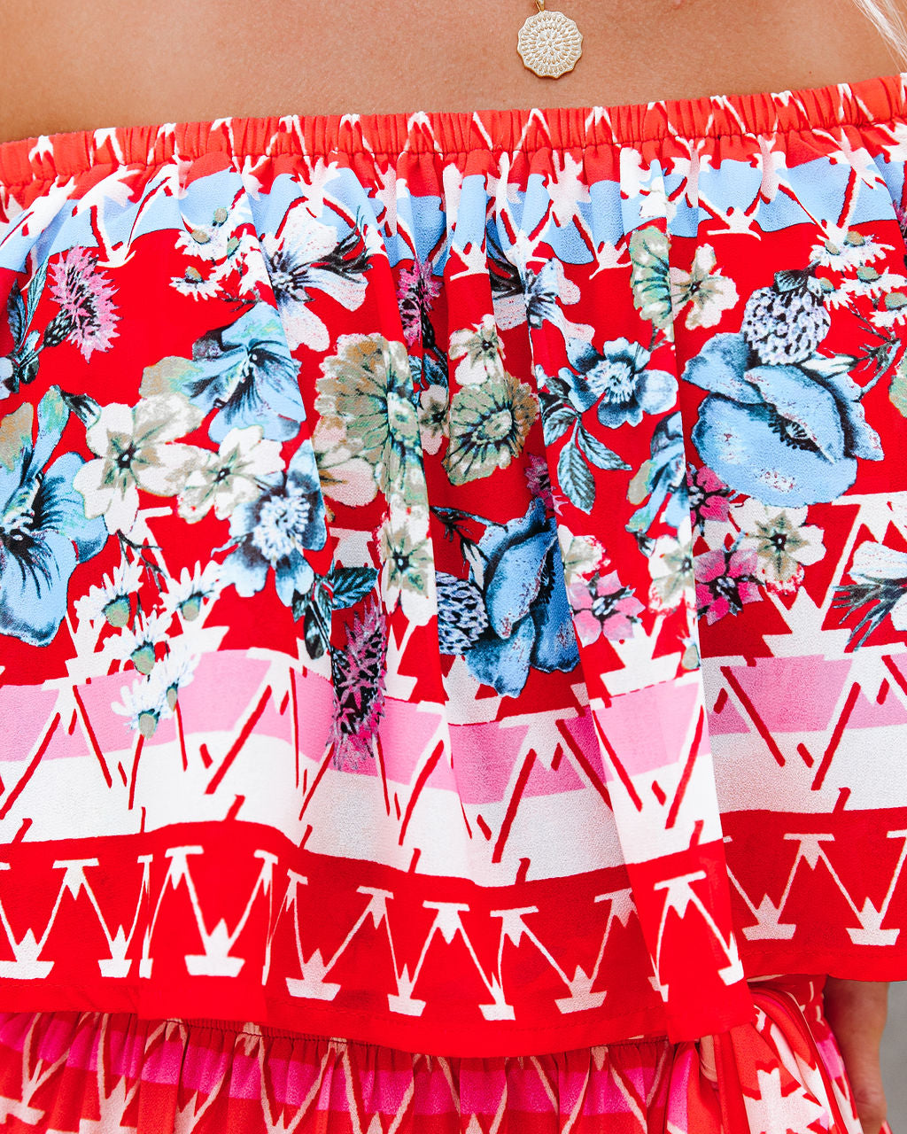 //Best Seller// Our Flora Farms Off The Shoulder Maxi Dress is a one hit wonder! Detailed to perfection with a multi-print in white. pink. red. blue. yellow. green. orchid. and lavender. Fashioned with a flowy top shelf and tiered skirt. It features an elastic waistband and elastic neckline for soft support. Complete with a belted waist tie. Styled with the Indigo Twisted Hoops. 5 Disc Choker. Minimal Herringbone Necklace. Flower Coin Necklace. Simple Bangle Bracelet. Galapagos Cuff. Stella Crossbody Envelope Zip Clutch. and Twiggy Criss Cross Heeled Sandal.