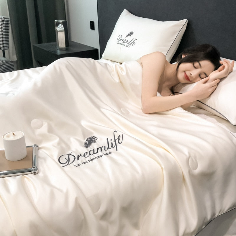 Fresh Green Summer Cool Blanket High-end Embroidery Quilting Queen Quilt Silky Breathable Ice Rayon Blankets Cooling Comforter