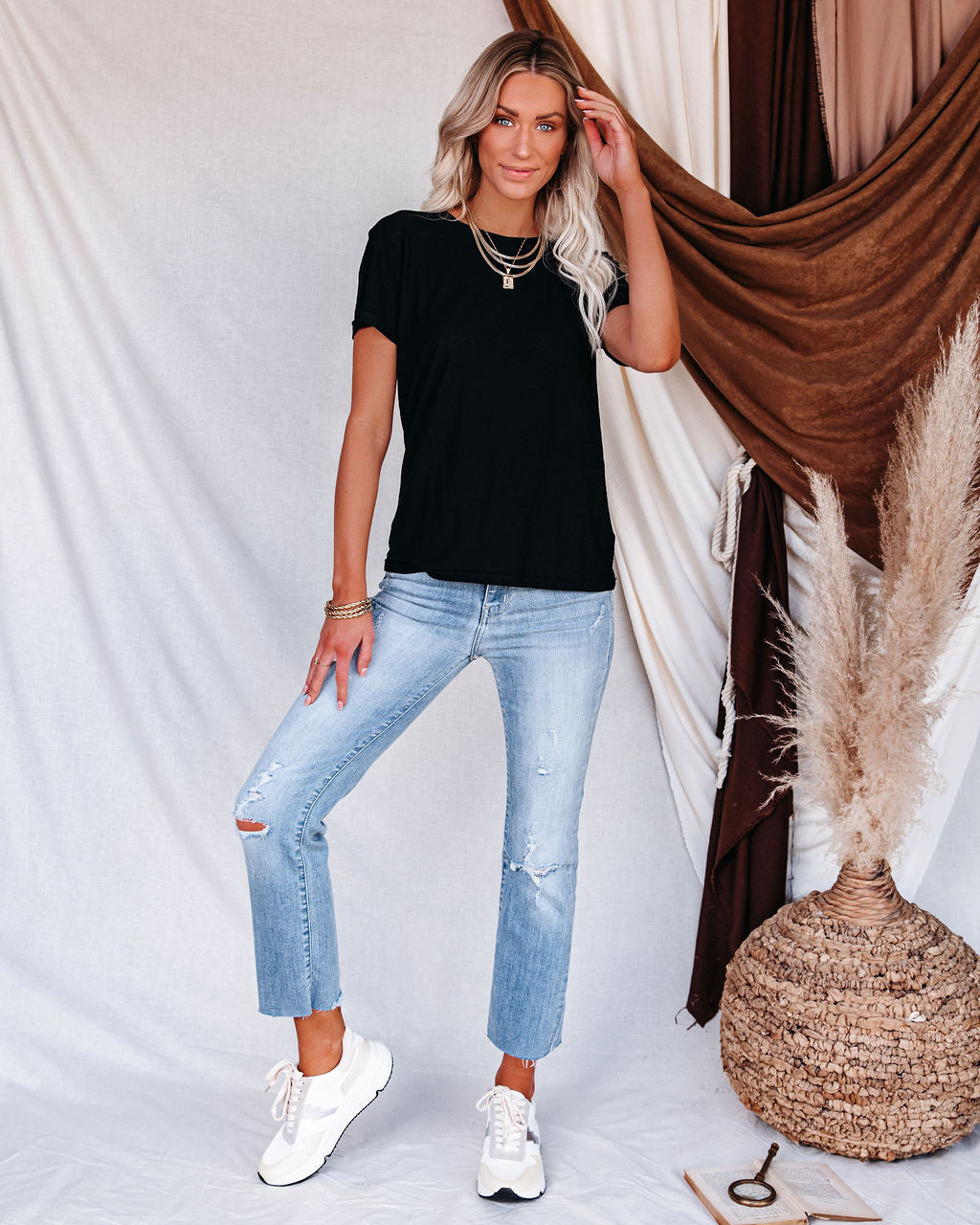 //Best Seller// Our best selling Malibu Crewneck Tee is back in black! This simple true to size scoop neck tee is the ideal go to for daily wear. We love the effortless fit. easy to style simplicity and forever on trend - comfort. The best selling cotton and modal blend makes this tee a go-to for year round wear. Styled with the Bee Happy Beaded Hair Pins. Zoe Layered Herringbone Necklace. Perfect Hoop Earrings. Initial Card Necklace. Cling Twisted Bangle Bracelet. Mcguire High Rise Distressed Denim. Al Fresco Cotton Blend Knit Pullover. and Sunrise Running Sole Sneaker.