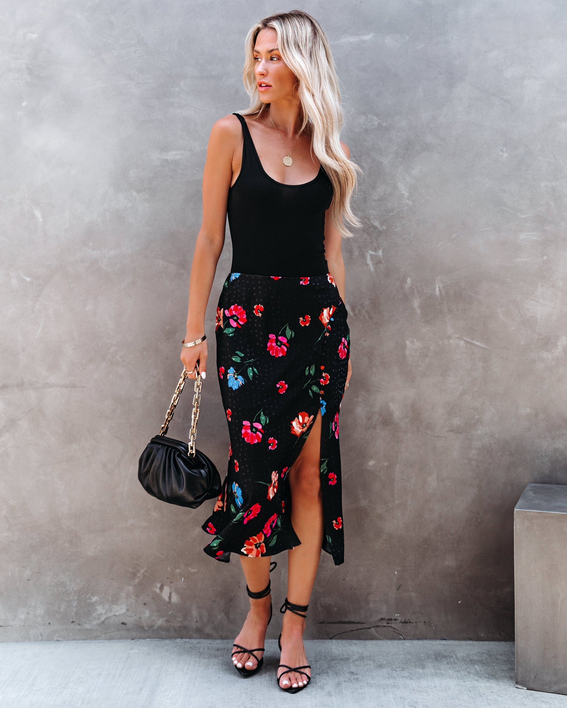 //Best Seller// Our Mariella Floral Slit Midi Skirt is perfect for salsa dancing nights! This black based midi features florals in hot pink. red. hunter green. orange. yellow. and cobalt. Finished with a side asymmetrical button down slit. Styled with the Gabi Hoops. Mosaic Coin Necklace. Simple Bangle Bracelet. Margot Baguette Ring. Chic Crossbody Chain Pouch Bag. Sleek + Chic Ribbed Bodysuit. and Bella Faux Leather Strappy Kitten Heel.