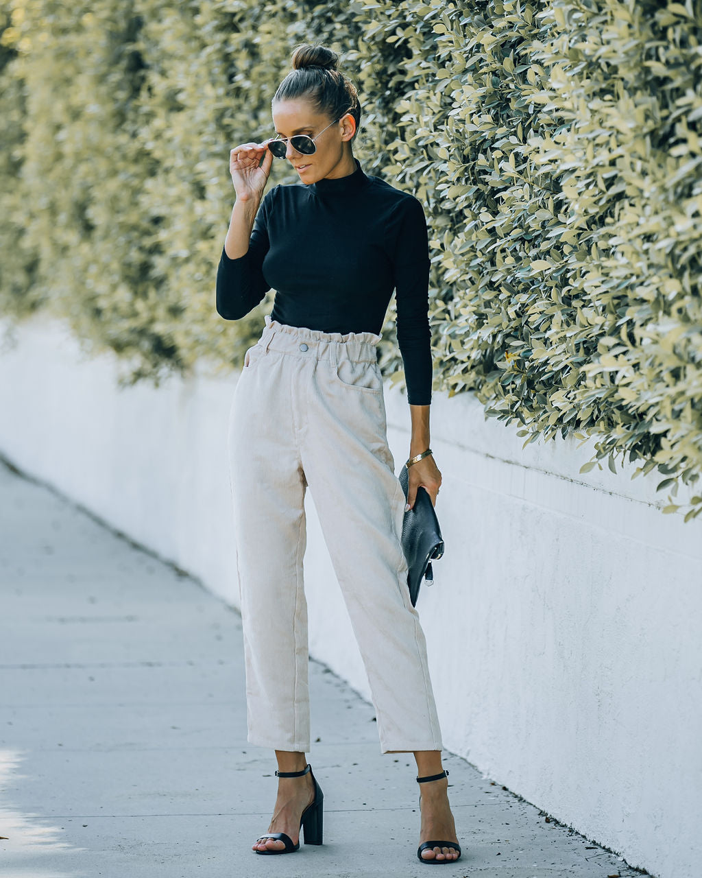 Our Mason Pocketed Corduroy Paper Bag Pants will elevate your wardrobe! These ivory high rise corduroy pants feature an elastic paper bag waist. Finished with a front button and zipper closure. Styled with the Simple Bangle Bracelet. Stella Crossbody Envelope Zip Clutch. day To Day Turtleneck Knit Top. and Whimsy Heel.