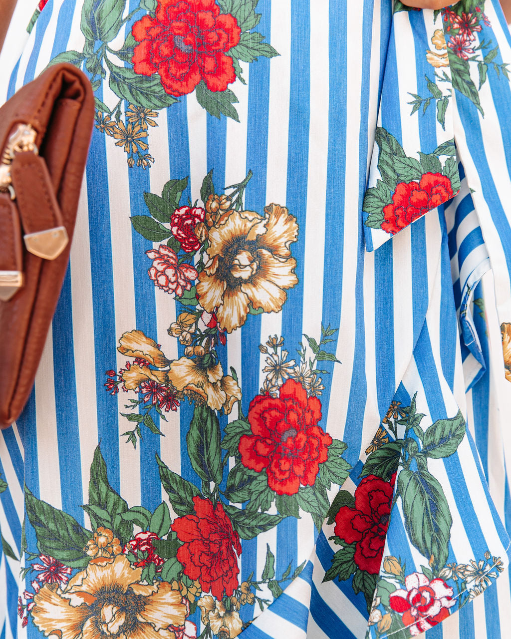 Our Matador One Shoulder Mixed Print High Low Dress is giving us major Barcelona vibes! This cobalt and ivory striped midi features a yellow. orange. charcoal. red. olive. and hunter green floral print. Designed with an adjustable waist tie and a high low hem. Styled with the Fawn Hammered Hoops. Redid Chain Necklace. Flower Coin Necklace. Minimal Herringbone Necklace. Simple Bangle Bracelet. Stella Crossbody Envelope Zip Clutch. and Cooper Block Heeled Sandal.