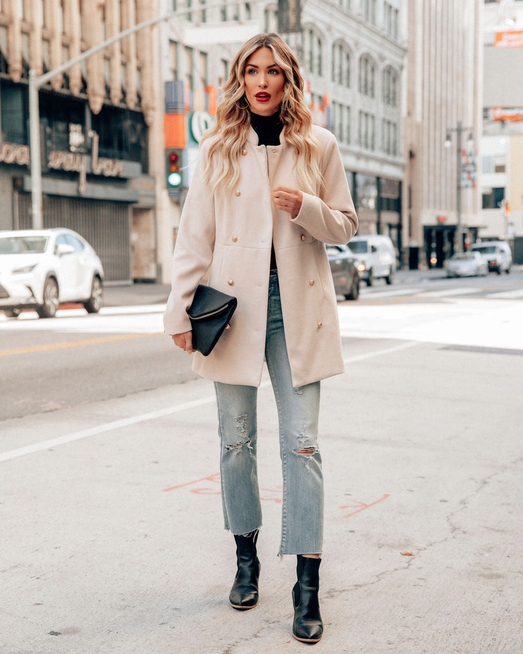 Head into the city for the night in our Meghan Pocketed Peacoat! This ecru peacoat is crafted with front gold button closures. Finished with side pockets. A no stretch fabrication. Styled with the Perfect Hoop Earrings. Stella Crossbody Envelope Zip Clutch. Averie Sleeveless Turtleneck Knit Top. Mcguire High Rise Distressed Denim. and Jocelyn Heeled Bootie.