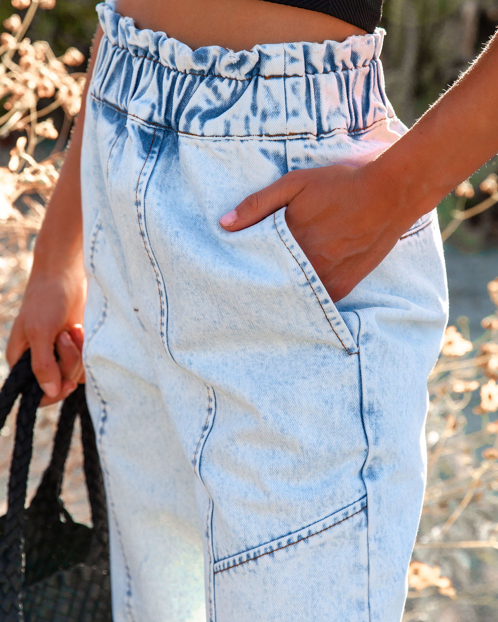 We're digging the Mercy High Rise Acid Wash Denim Joggers in a light vintage wash detailed with side pockets.