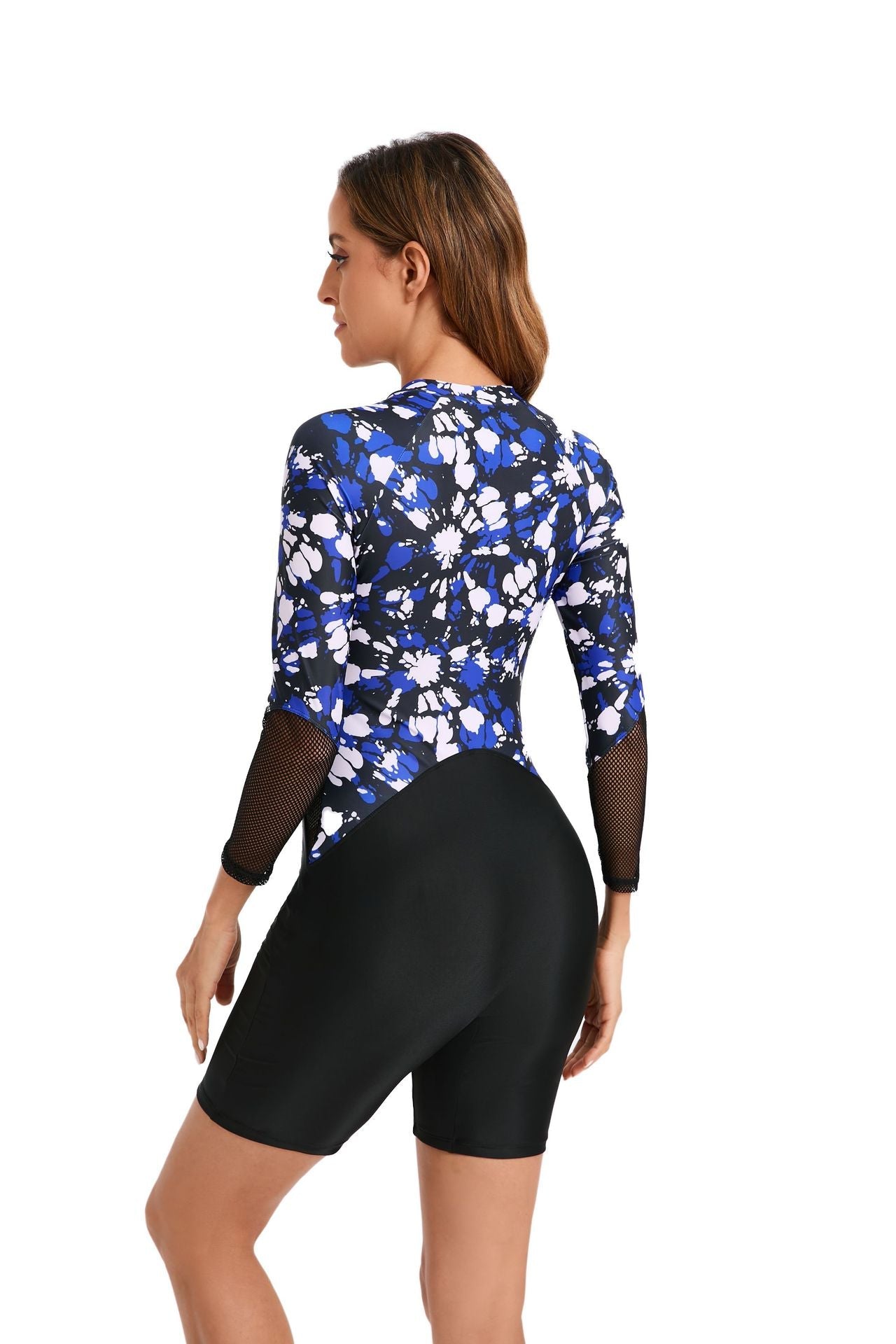 Mesh Panel Long-Sleeve Zip-Up One-Piece Swimsuit with Boy Shorts