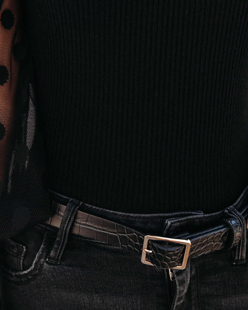Sheer sleeves steal the show on our Mina Contrast Polka Dot Sleeve Knit Top! This trendy black top features a fitted bodice. square neckline and ribbed knit fabric. Tuck into high rise denim for a date night inspired look. Styled with the Molly Crossbody Clutch. Volt High Rise Distressed Skinny. and Whimsy Heel.