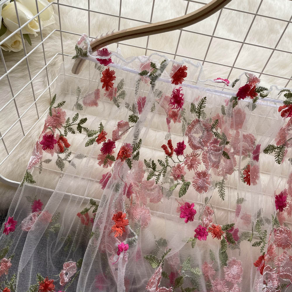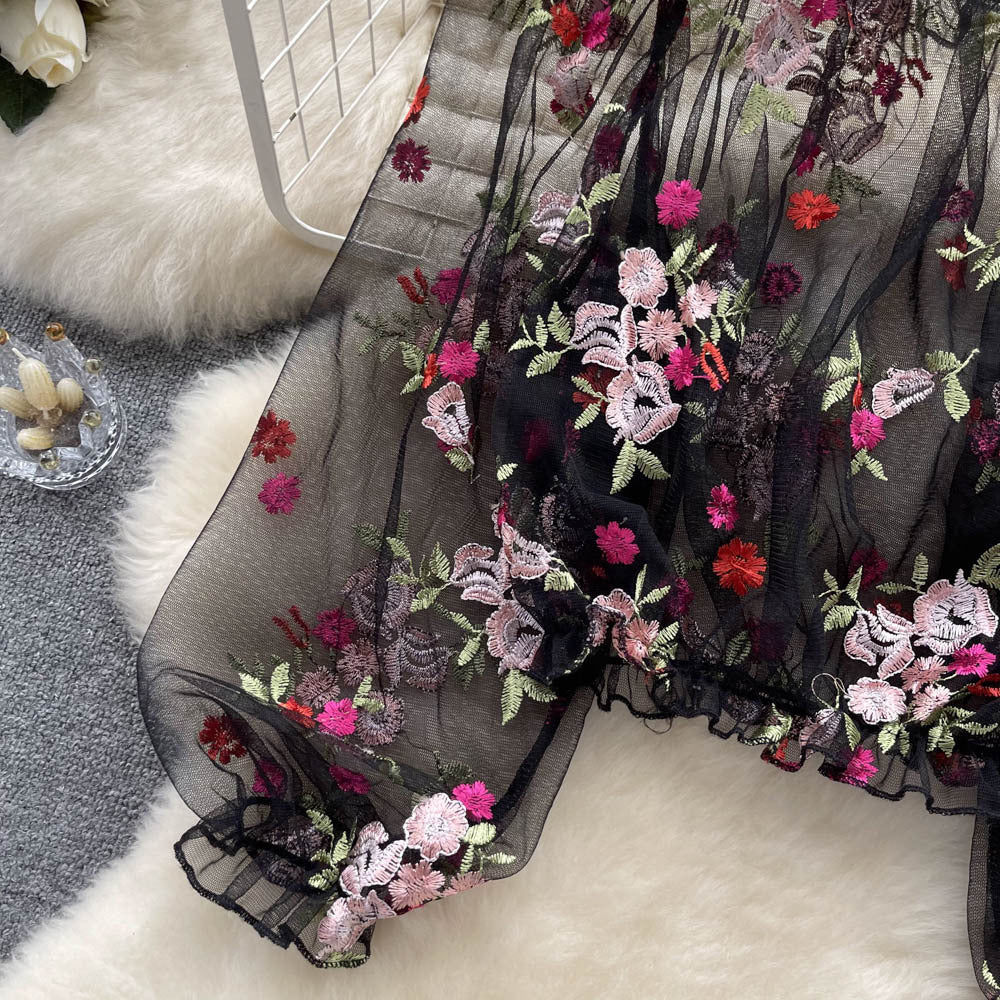 Embrace delicate femininity with our Off-Shoulder Mesh Embroidered Blouse, designed to add a touch of dreamy elegance to your wardrobe. This see-through lace top features intricate embroidery, playful bubble sleeves, and a cropped silhouette, making it the perfect layering piece for effortless chic.