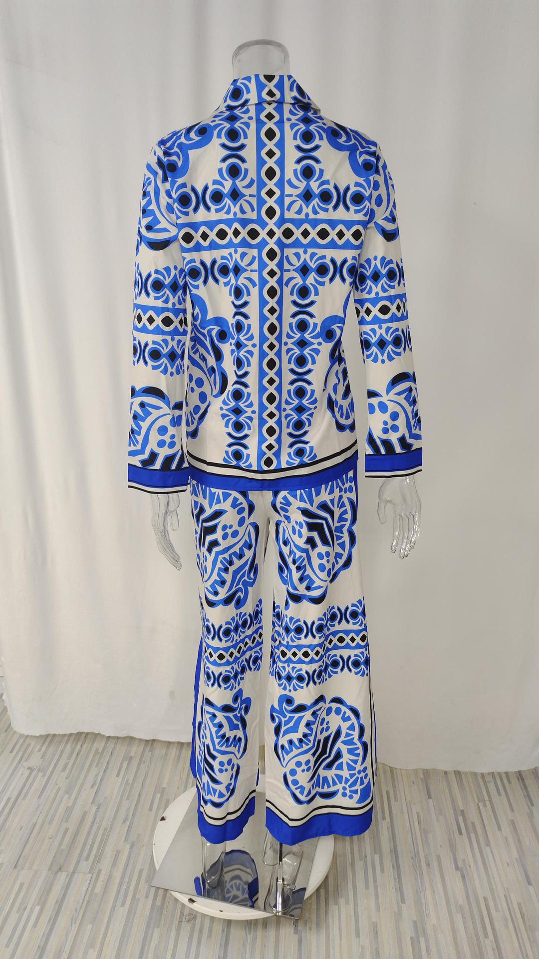 This fashion-forward ensemble features a printed stand-collar top with relaxed batwing sleeves for a chic, effortless look. Paired with high-waisted wide-leg pants, this set flatters every body type while offering a modern, flowy silhouette.