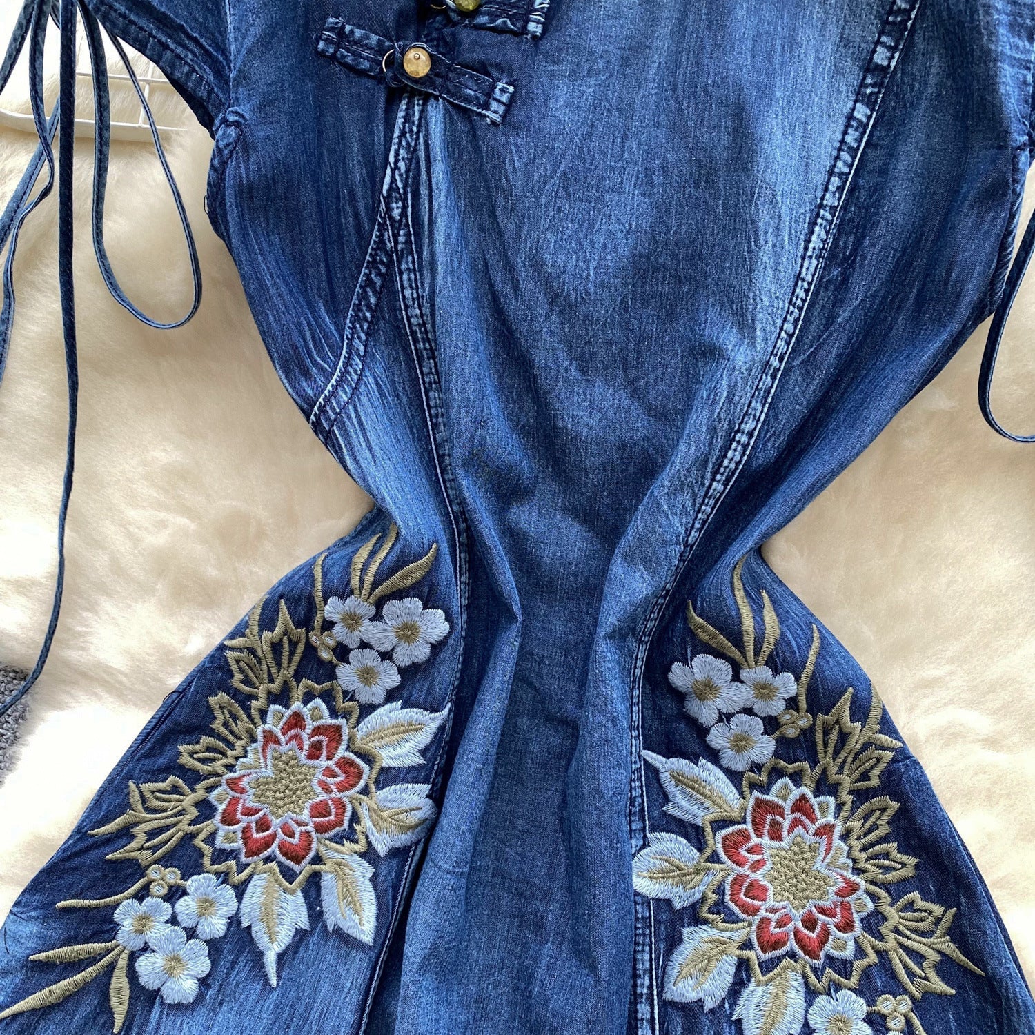 Step into timeless sophistication with our Retro Elegant Women's Dress, designed to exude French-inspired高级感 (high-end allure). Featuring a refined high collar, delicate short sleeves, and intricate embroidery, this belted denim maxi dress effortlessly combines vintage flair with modern femininity.