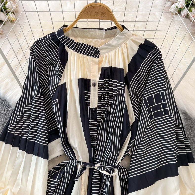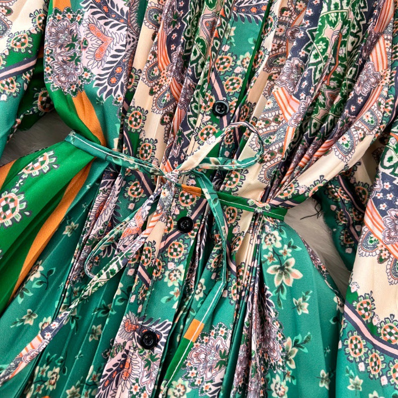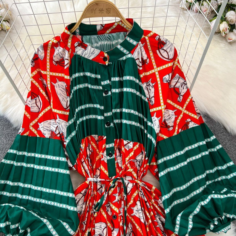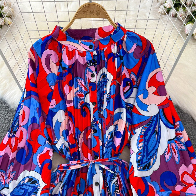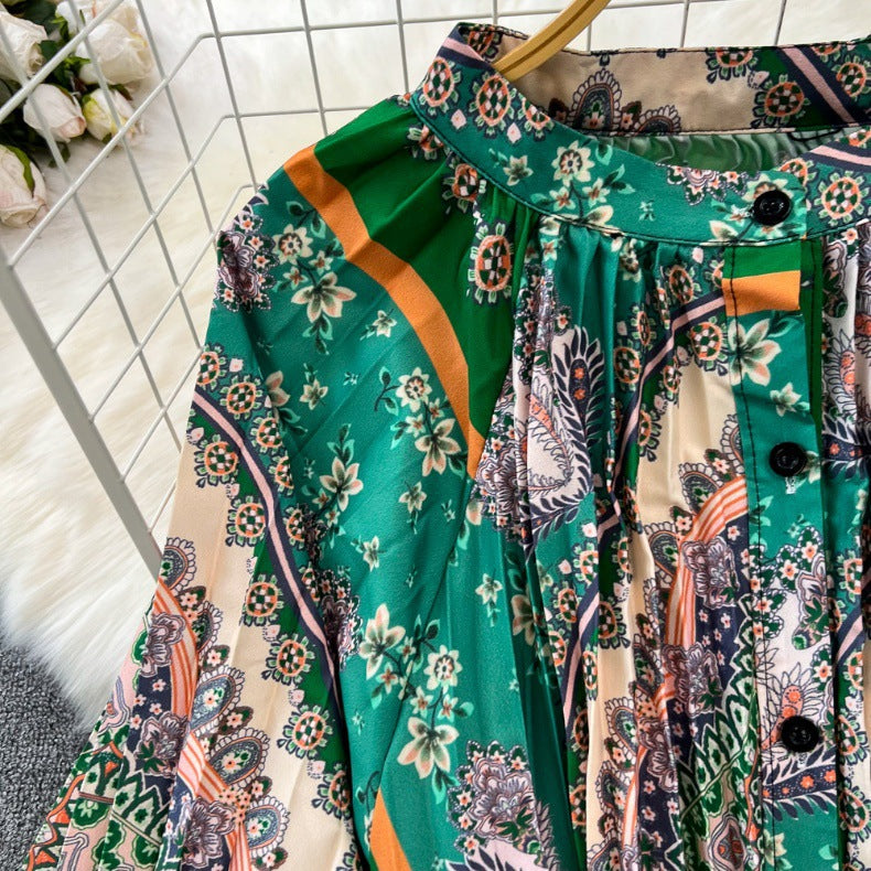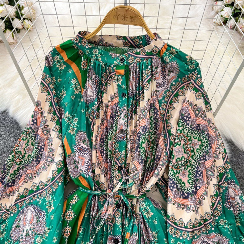 Retro Palace Style Lantern Sleeve Round Neck A-Line Floral Print Button-Down Waist Dress