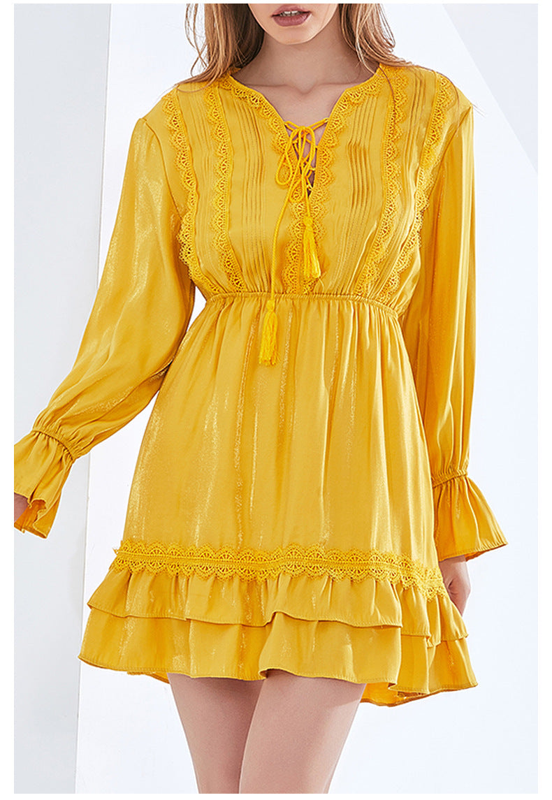 Retro V-Neck Tie-Waist Flare Sleeve Short Dress
