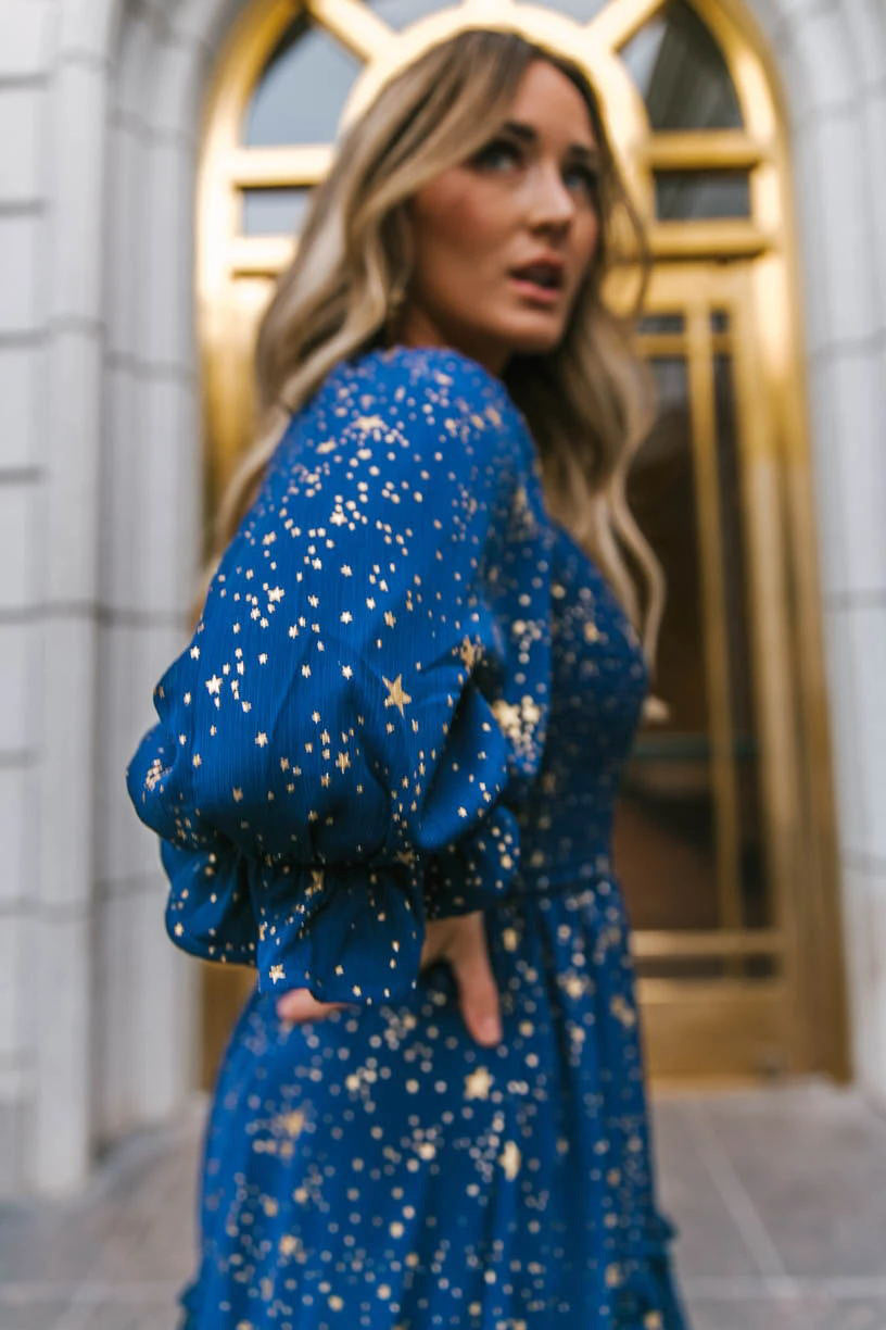 Standout in the office in our Rivermark Printed Ruffle Tiered Dress! This cobalt. navy. and aqua blue printed mini features sleeves. Designed with elastic cuffs and an elastic waistband. Styled with the Brighton Hoop Earrings. Lauren Chain Cuff. and Lavish Patent Leather Pumps.