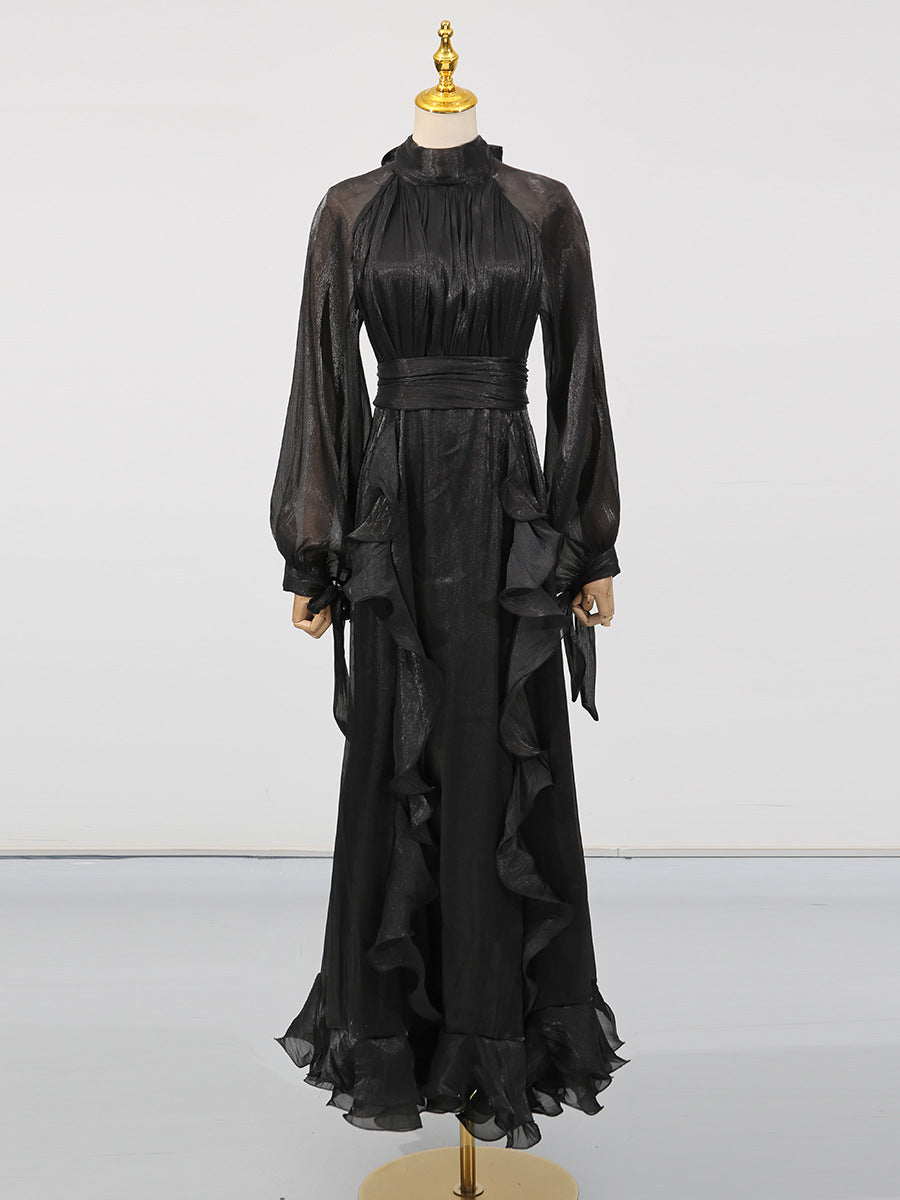 Summer Stand Collar Lantern Sleeve Ruffled Waist Dress for Women