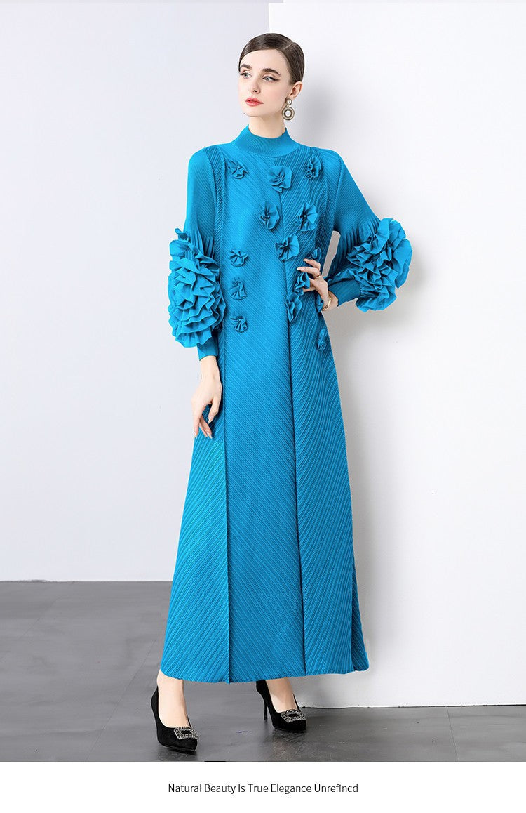 Stylish Slim-Fit Solid Color High Neck Dress with 3D Flowers