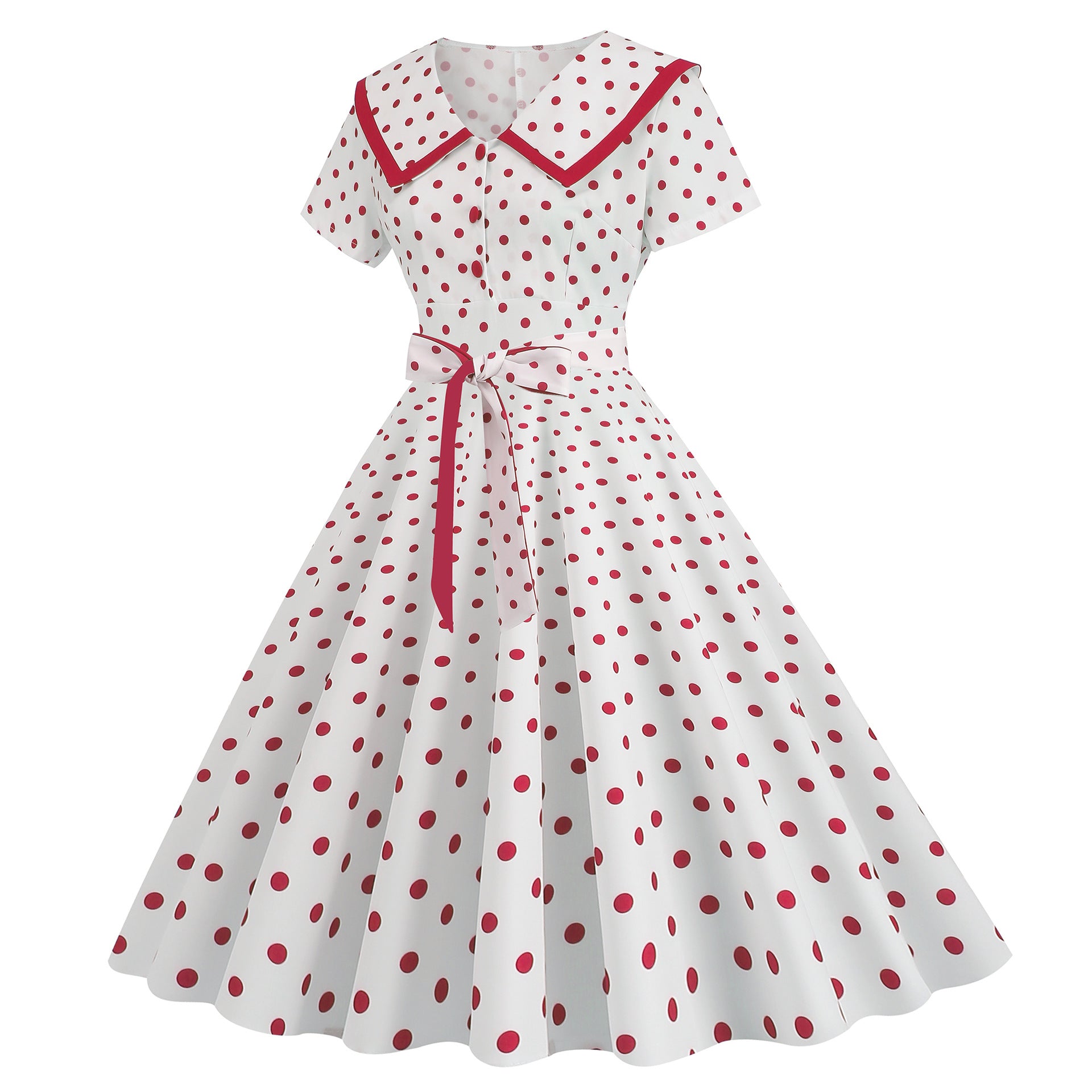 Embrace timeless elegance with our Vintage-Inspired Polka Dot Flared Dress! Designed to flatter your figure, this retro A-line dress features a classic notched lapel collar, a adjustable wrap waist belt for a customizable fit, and a graceful full skirt that sways with every movement. The playful polka dot print adds a touch of nostalgia, while the strategically placed pattern and tailored silhouette create a slimming effect. Perfect for both casual and formal occasions, this dress is a must-have for any vintage-loving wardrobe.