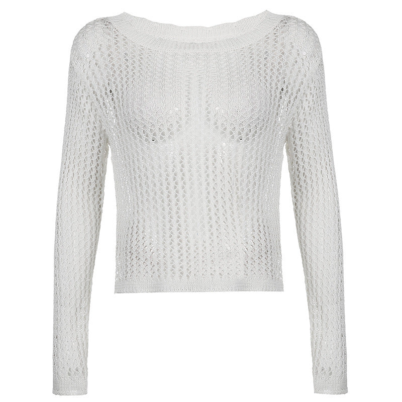 Elevate your wardrobe with this chic women's oversized mesh knit sweater, featuring a hollow-out round neck and long sleeves for a trendy, see-through look. Perfect for layering or wearing solo, this loose-fit top offers a flattering silhouette with a touch of allure.