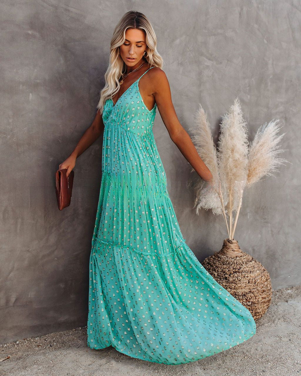 Elevate your casual wardrobe with this chic sleeveless dress featuring a fresh leopard print and soft green hue. Designed for effortless style, this strappy sundress includes delicate ruffle detailing at the neckline for a feminine touch.