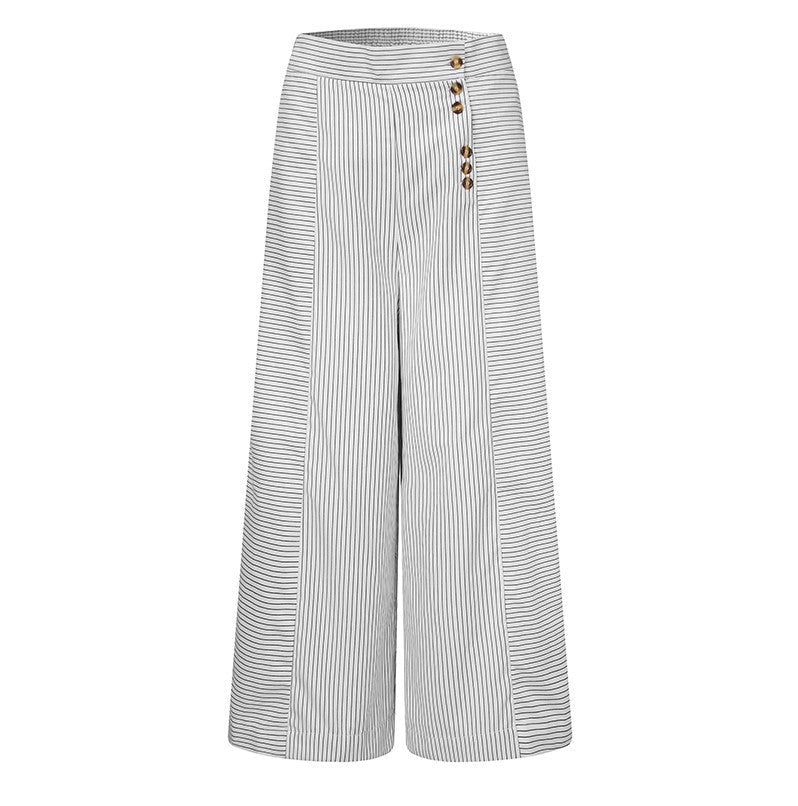 Designed for comfort and fashion, these loose-fit trousers feature a flattering high-waisted silhouette, bold stripes, and a relaxed wide-leg cut. The chic button detail adds a trendy touch, making them perfect for casual outings, beach days, or effortless street-style looks.