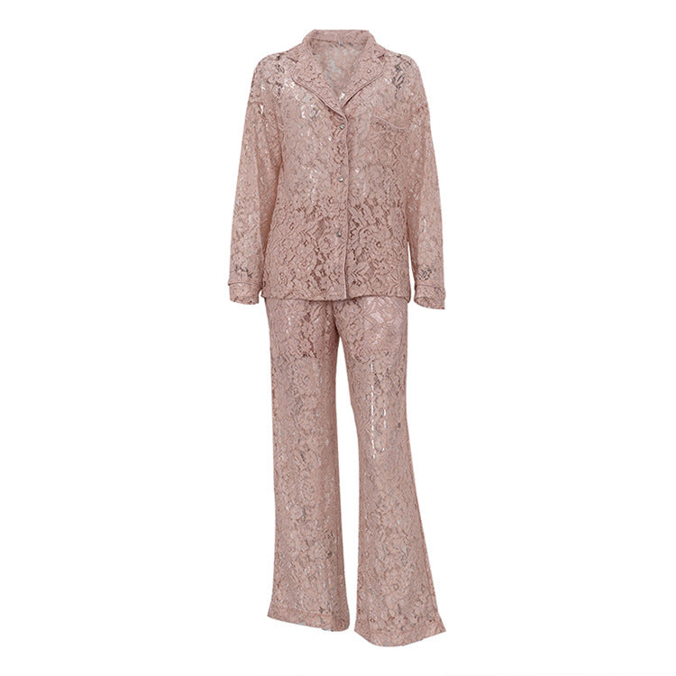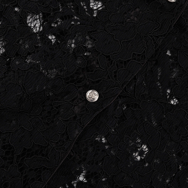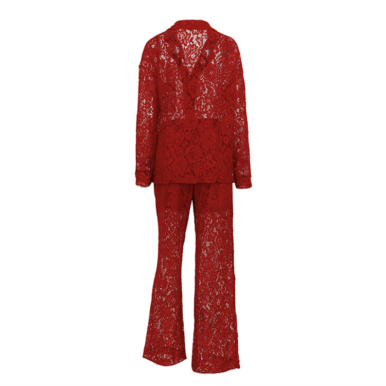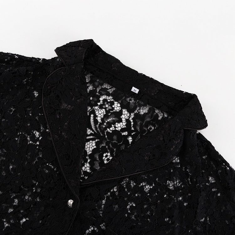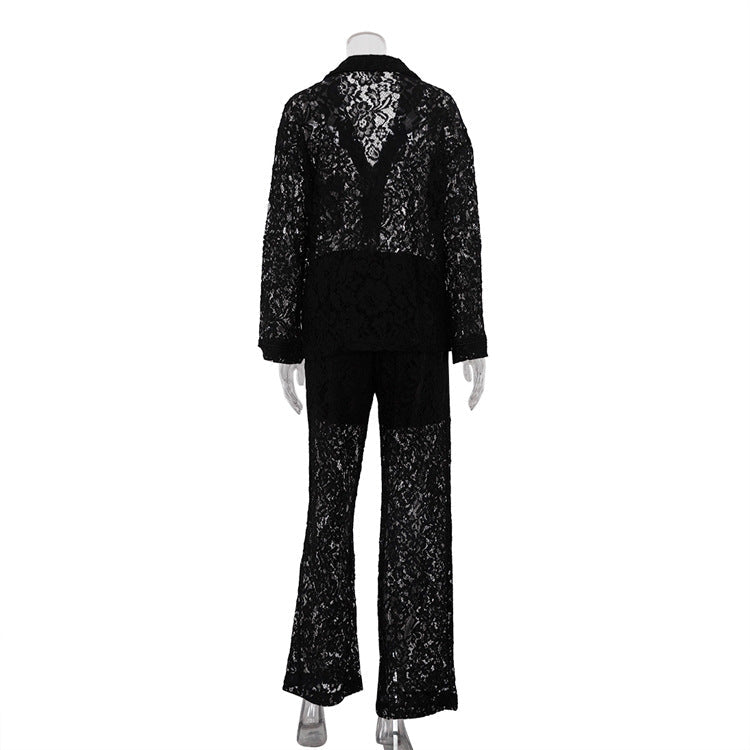 Command attention with this provocative yet polished lace two-piece set, where bold transparency meets tailored sophistication. The set features a structured lapel shirt with strategic lace panels, paired with high-waisted wide-leg trousers for a powerful fashion statement that balances office-chic with night-out glam.