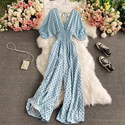 Elevate your wardrobe with this sexy V-neck batwing sleeve jumpsuit, designed to flatter your figure with a waist-cinching silhouette for a slimming effect. The playful polka dot print adds a touch of retro charm, while the flowy batwing sleeves provide effortless elegance. Perfect for casual outings, date nights, or stylish events, this breathable and comfortable jumpsuit ensures you stay chic all day.