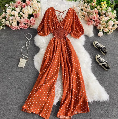 Women's Sexy V-Neck Batwing Sleeve Waist-Cinching Slimming Polka Dot Print Jumpsuit